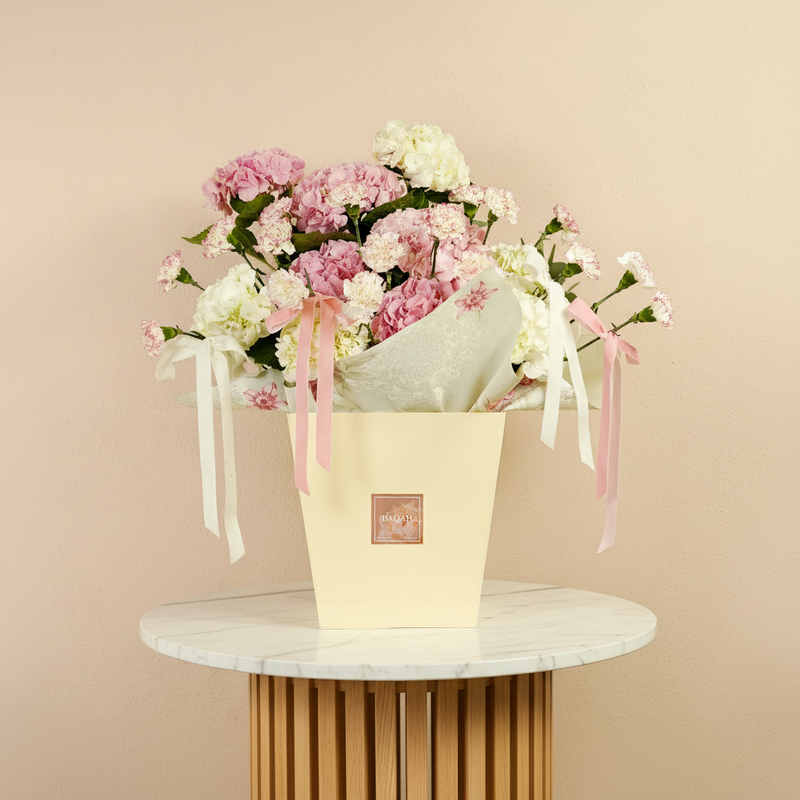 Experience the grace of soft pink and creamy white blooms, elegantly presented in a modern, charming box. This exquisite Box Arrangement offers a sophisticated, ready-to-display statement perfect for any cherished occasion.