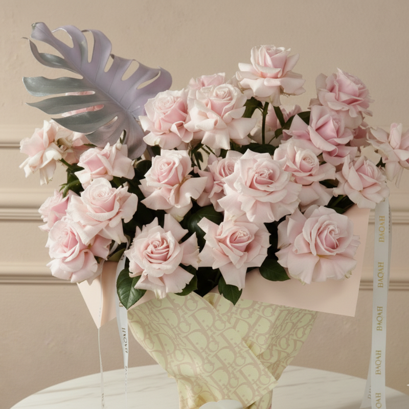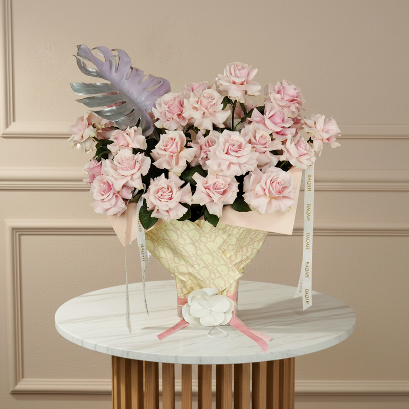25 elegant pink roses are expertly arranged in a tall, upright, and supportive display. This stunning standing bouquet makes a sophisticated and graceful statement, perfect for any grand celebration.