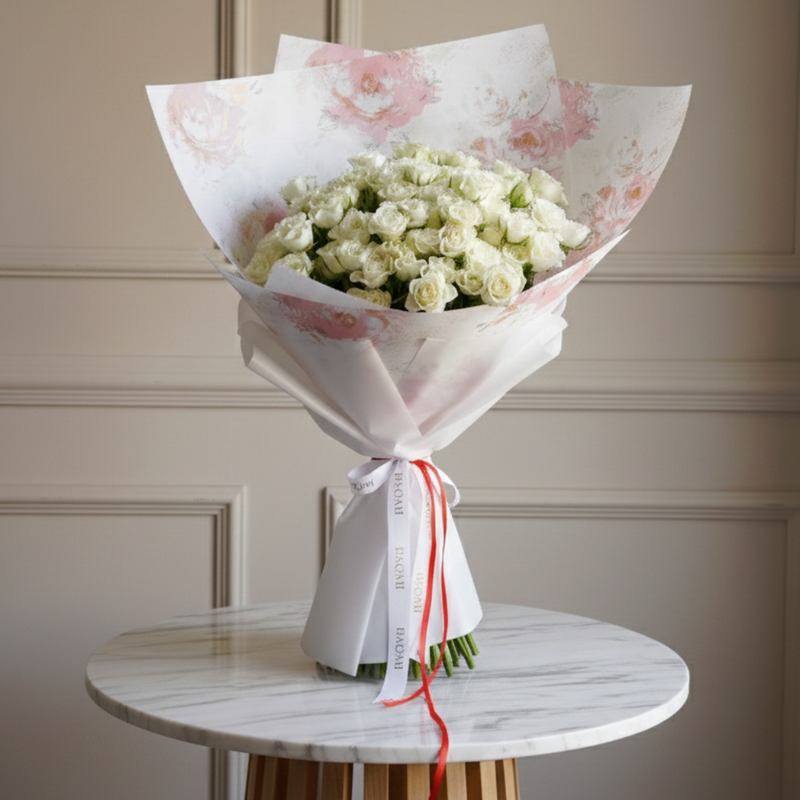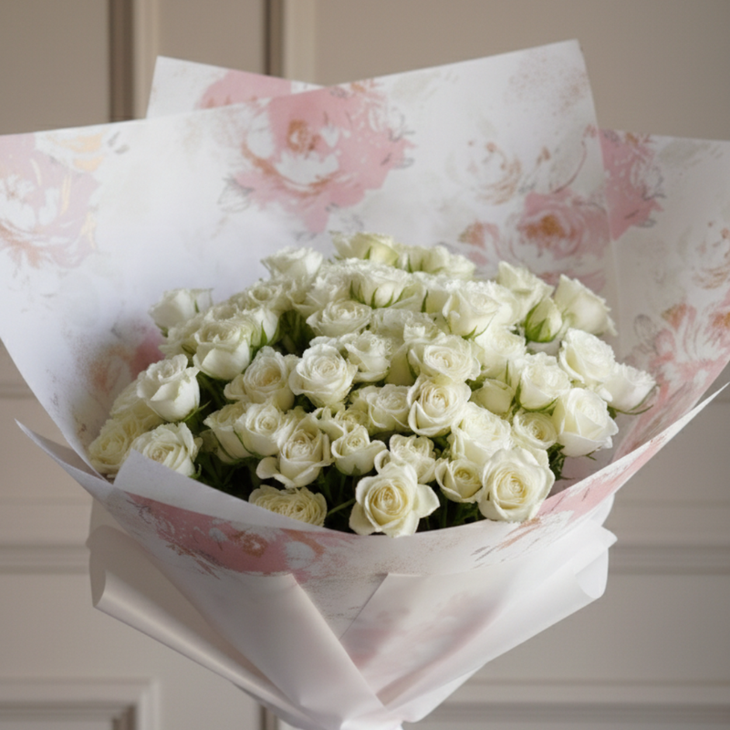 Radiate elegance with 20 delicate white baby roses, masterfully hand-tied into a soft, snowy cluster. Wrapped in sophisticated floral-patterned paper and finished with signature ribbons, this ethereal bouquet is a graceful expression of sincere devotion. A timeless gesture for a love that is truly pure.