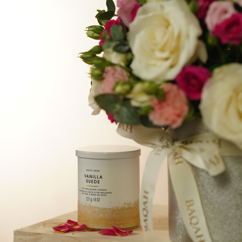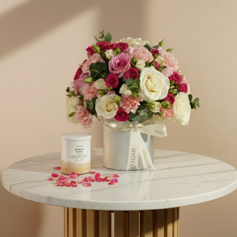 An elegant medley of pink and white roses, carnations, baby roses, and eucalyptus — artistically arranged in a silver glossy vase. This design radiates grace and freshness, perfect for adding a soft romantic charm to any space or gifting for life’s most beautiful moments.