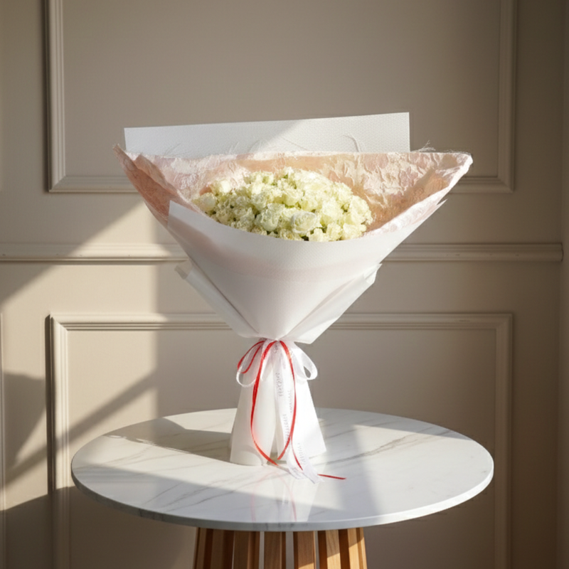 A delicate hand-tied bouquet of 20 pristine white baby roses, bursting with soft, romantic charm and subtle sophistication. Expertly arranged for gentle volume and perfect balance, wrapped in luxurious matte white Italian paper with fine ruffles and finished with a silky ivory ribbon. The epitome of pure, timeless love this Valentine's Day.