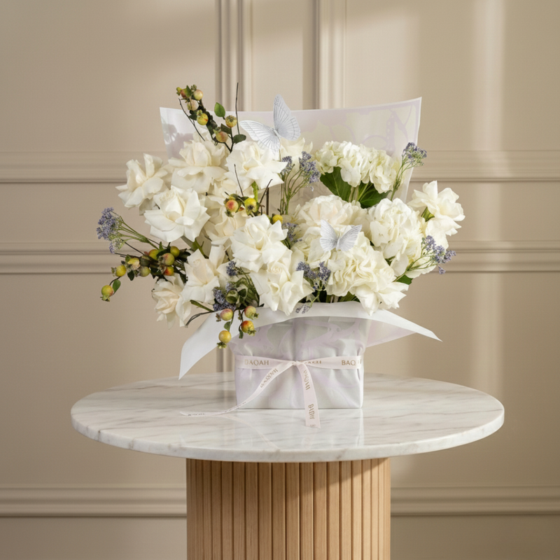 A majestic fusion of four white hydrangeas, fifteen Vandella, and ten Playa Blanca roses creates a lush, creamy foundation. Accented with artificial pomegranate and purple gypsophila, this architectural standing bouquet is encased in a signature light purple butterfly wrap, offering a sophisticated statement of whimsical luxury.