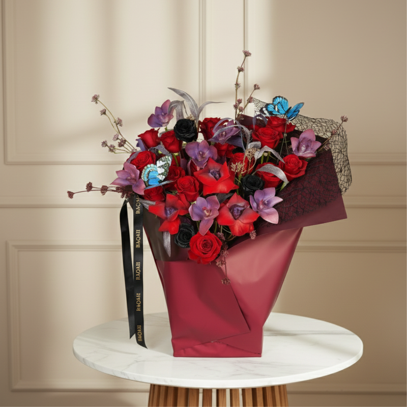 A dramatic fusion of twenty-five Freedom roses and three black infinity roses creates a bold, luxurious contrast. Accented with artificial cymbidium, textural leaves, and whimsical butterflies, this architectural standing bouquet is encased in a deep maroon wrap, offering a sophisticated, modern statement of eternal mystery.