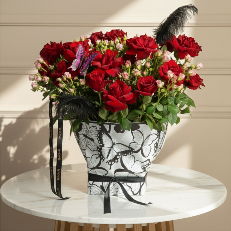 A dramatic architectural display featuring a 25 Explorer roses intertwined with 10 pink spray roses. Accented by 2 black ostrich feathers and whimsical butterflies, this standing bouquet is encased in a striking black butterfly-patterned wrap, creating a bold, sophisticated statement of mystery and elegance.