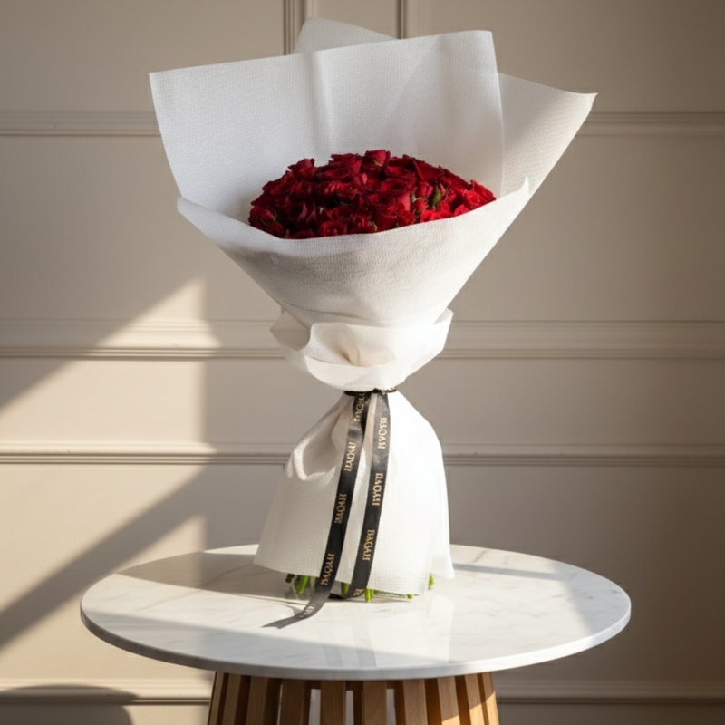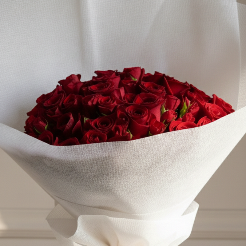 A lavish hand-tied masterpiece featuring 25 passionate red roses and ten delicate baby roses. Wrapped in sculptural white paper with romantic gold heart accents and flowing ribbons, this voluminous bouquet offers a rich, textural expression of deep devotion and timeless elegance.