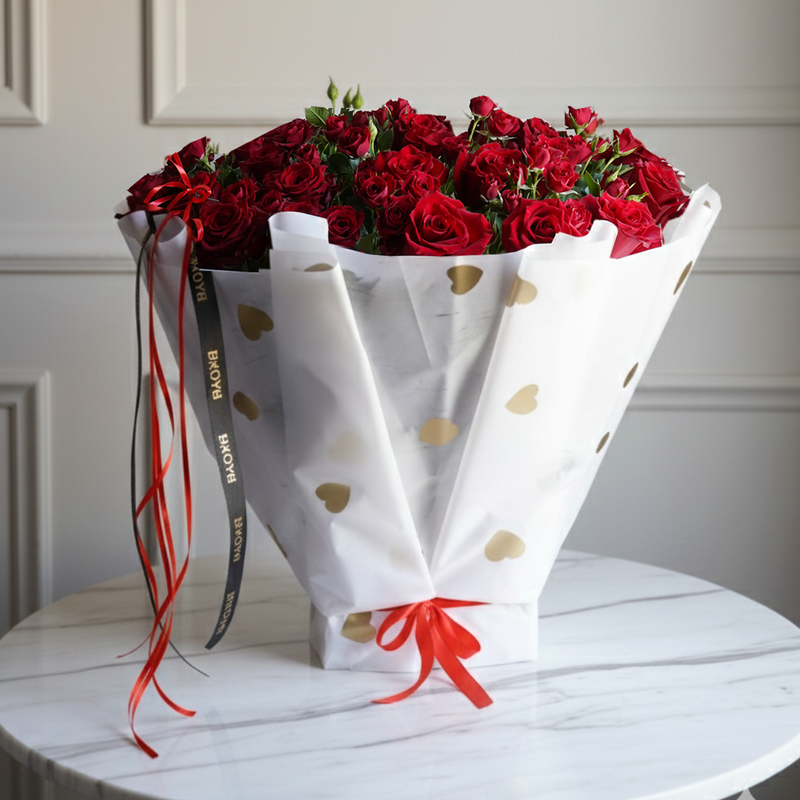 A towering architectural masterpiece featuring twenty-five passionate red roses and ten delicate baby roses. Expertly nestled in a structured white standing wrap with romantic red ribbons, this majestic silhouette makes a bold, high-impact statement of eternal devotion for your Valentine.